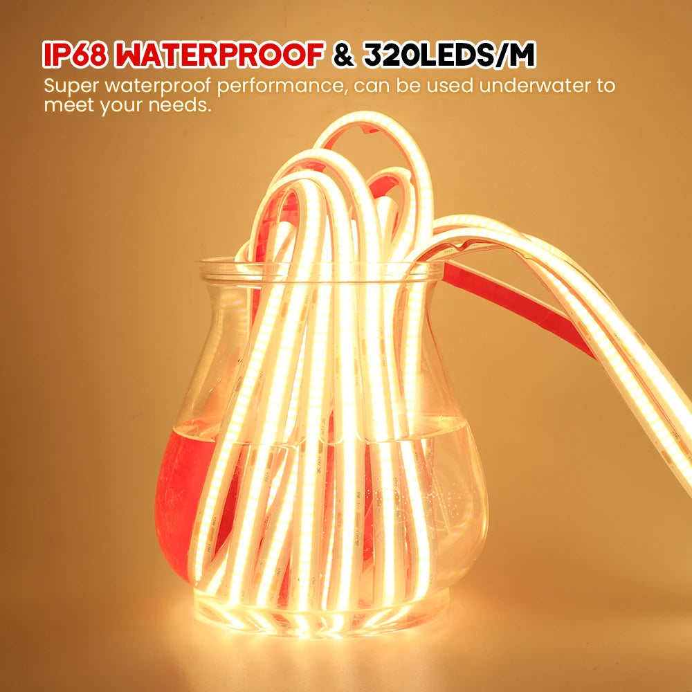 Easy Installation: The IP68 waterproof COB NEON light strip is suitable for both indoor and outdoor use with low temperature, fast connection, and installation. Note: Avoid immersing the strip in water.