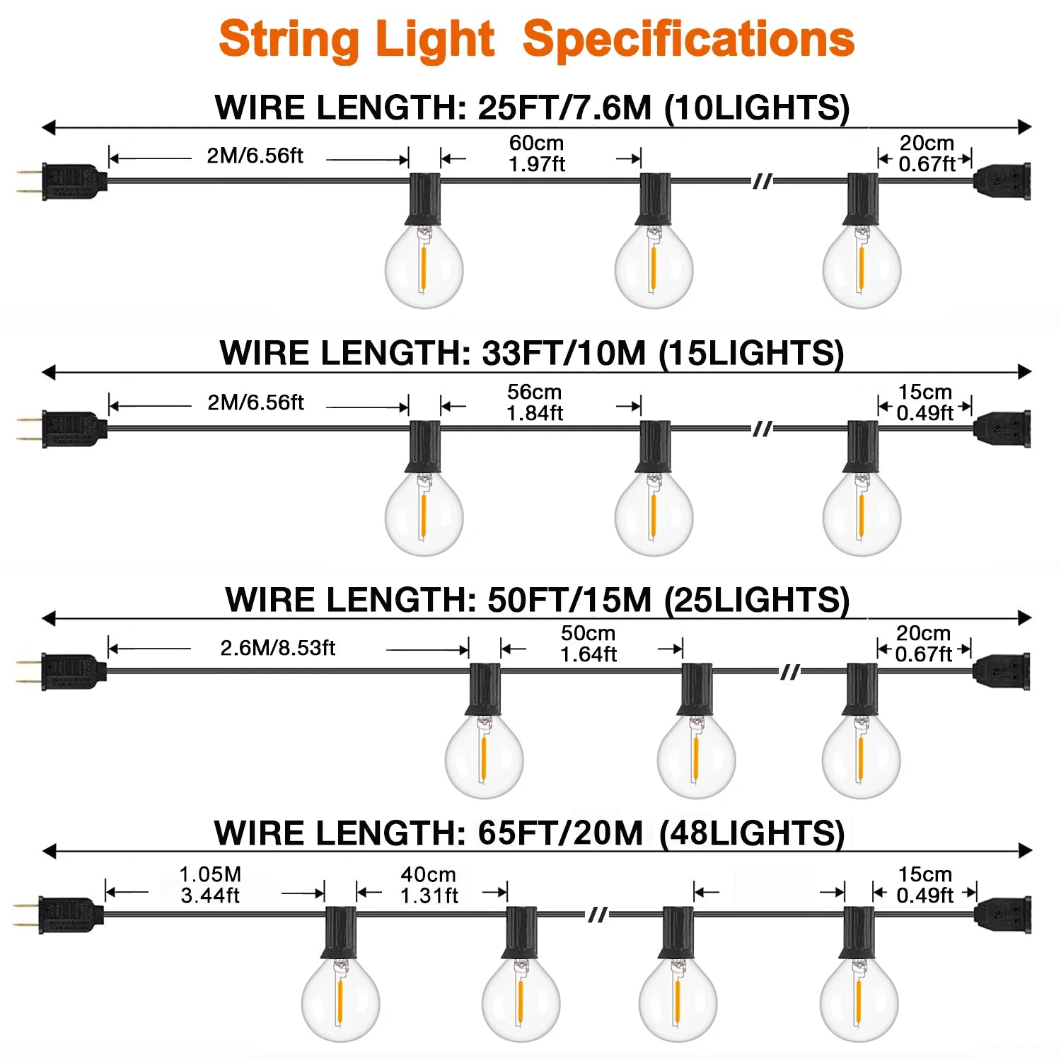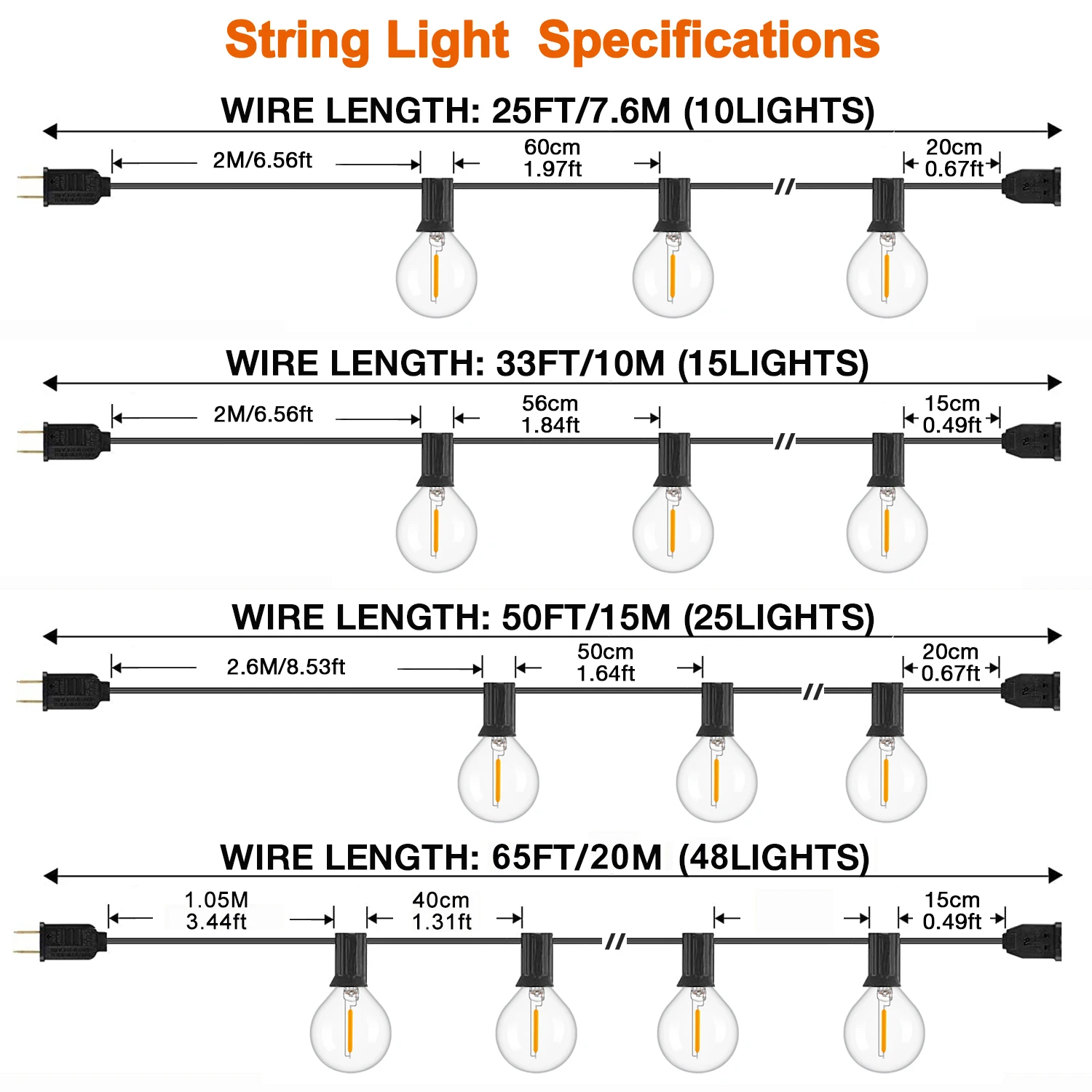 • G40 string Light with four length:25FTMeters(7.6M 10Lights),33FT(10Meters 15 Lights),50FT(15Meters 25 Lights),65FT(20Meters 48 Lights),Each String Light with E12 based hanging sockets,this LED string light is connectable max 480W and compatible with most Dimmer(dimmer not included).