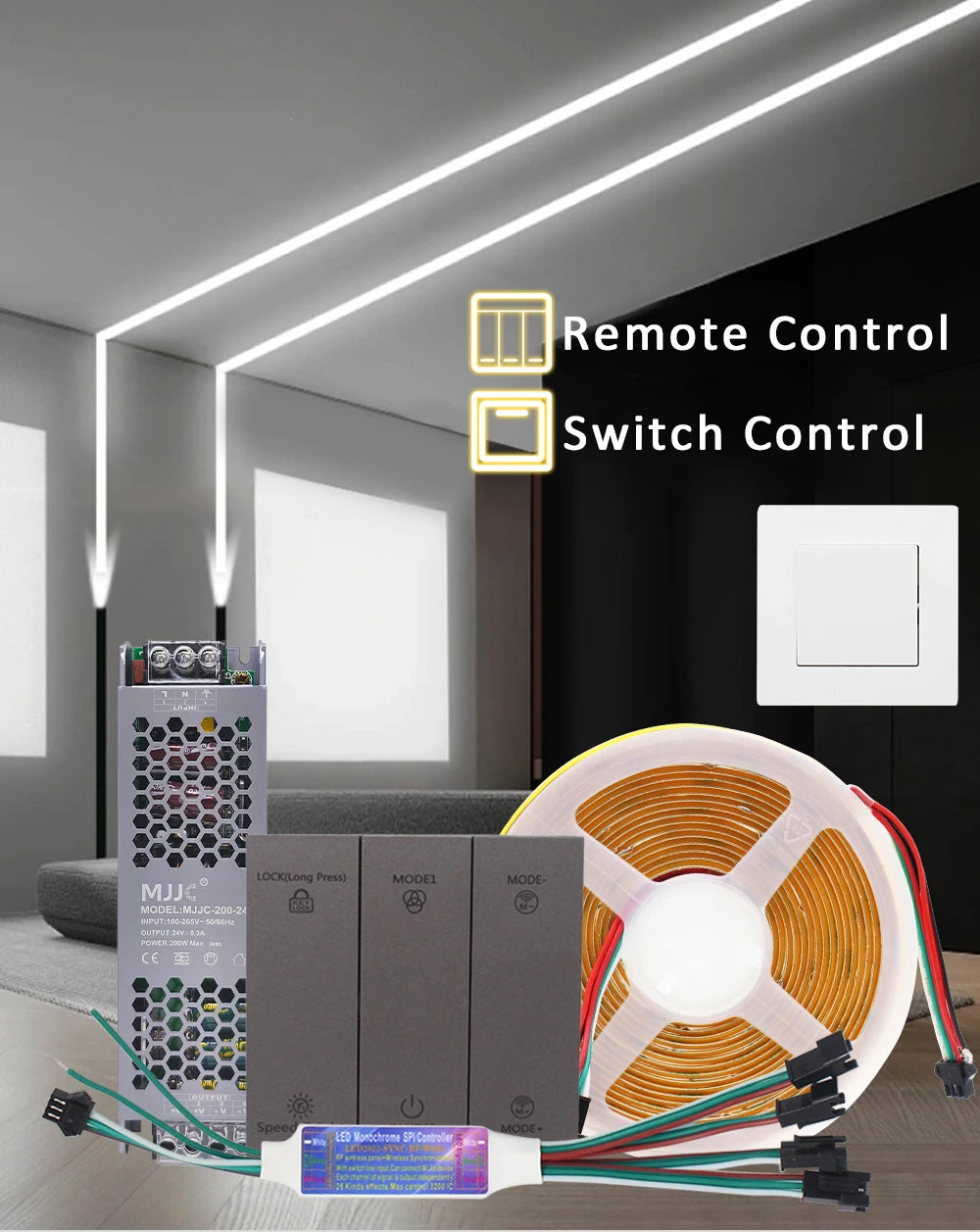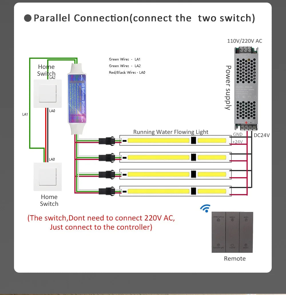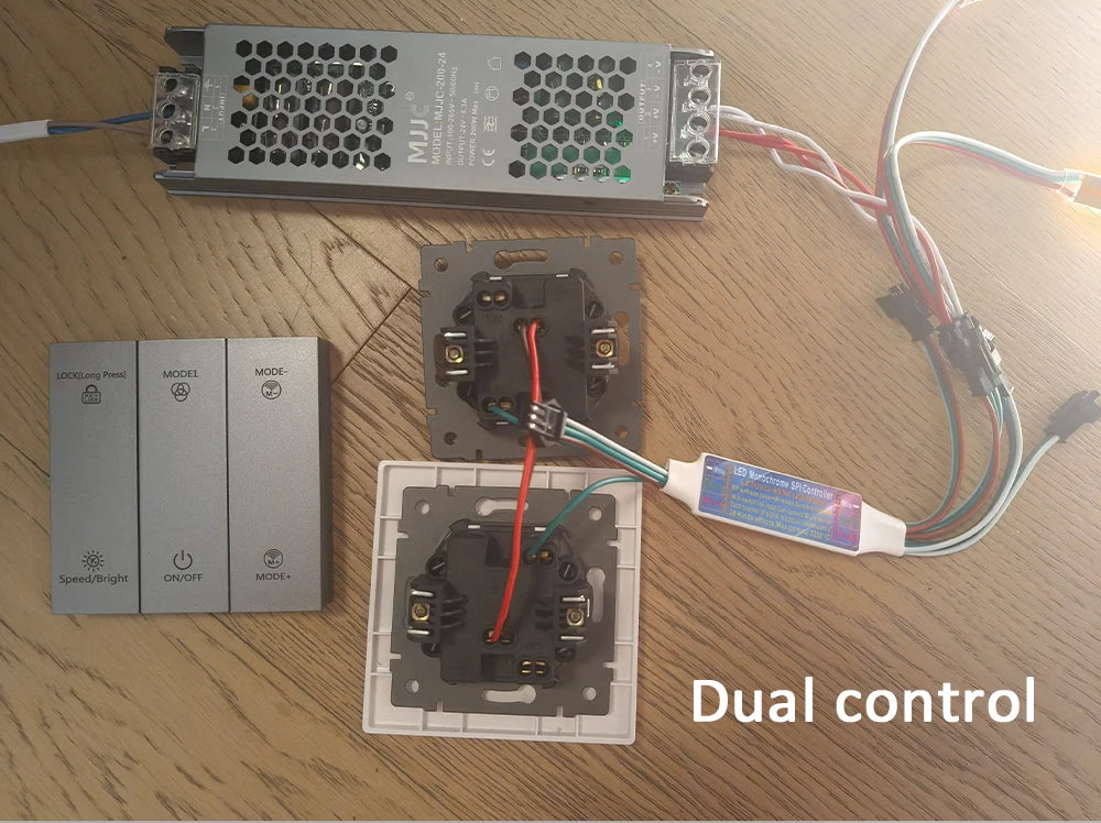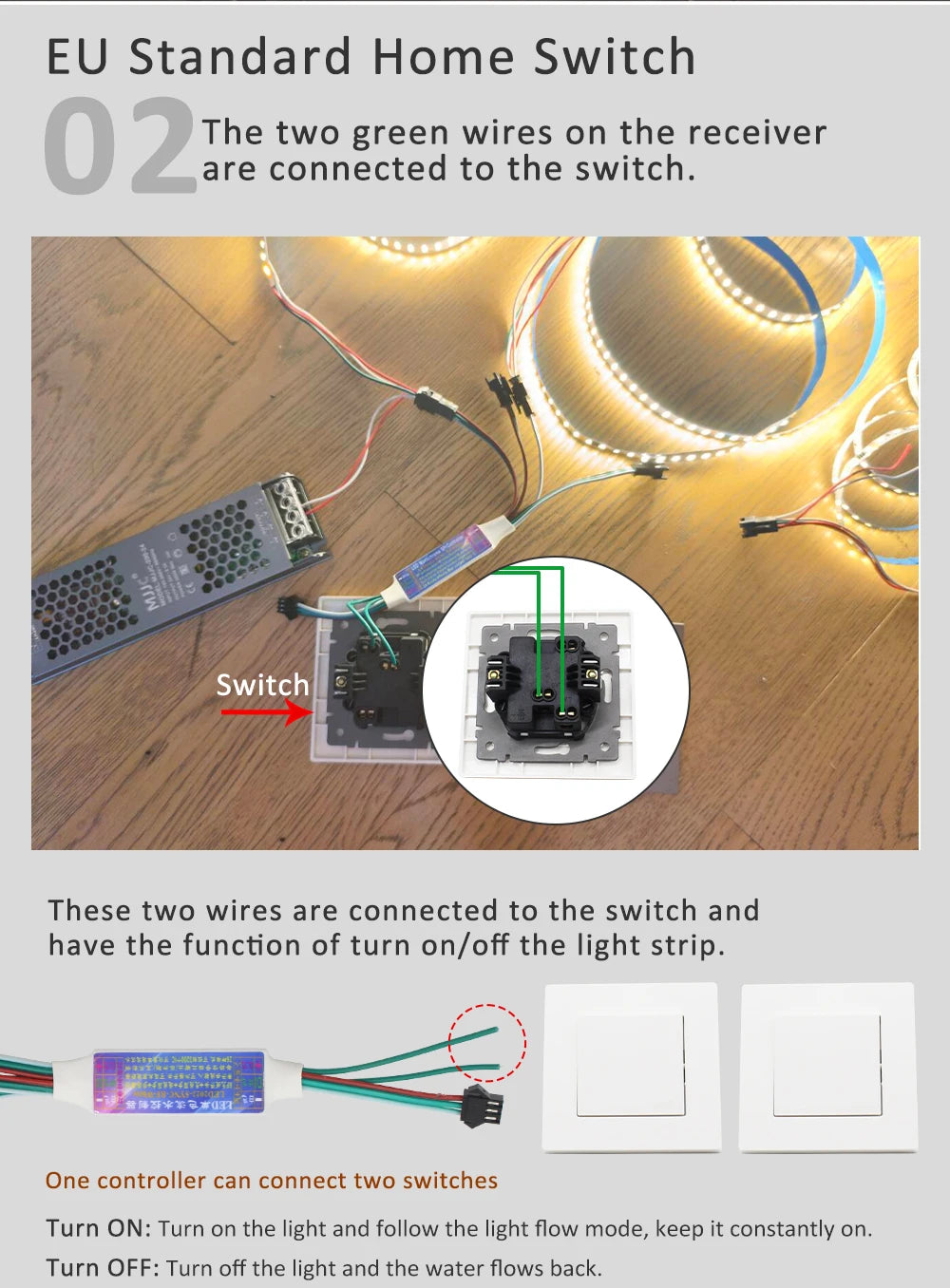 3. The controller can be work with normal switch, Turn ON/OFF by the switch without remote.It also can connect to Mihome Smart Switch to realize voice control.