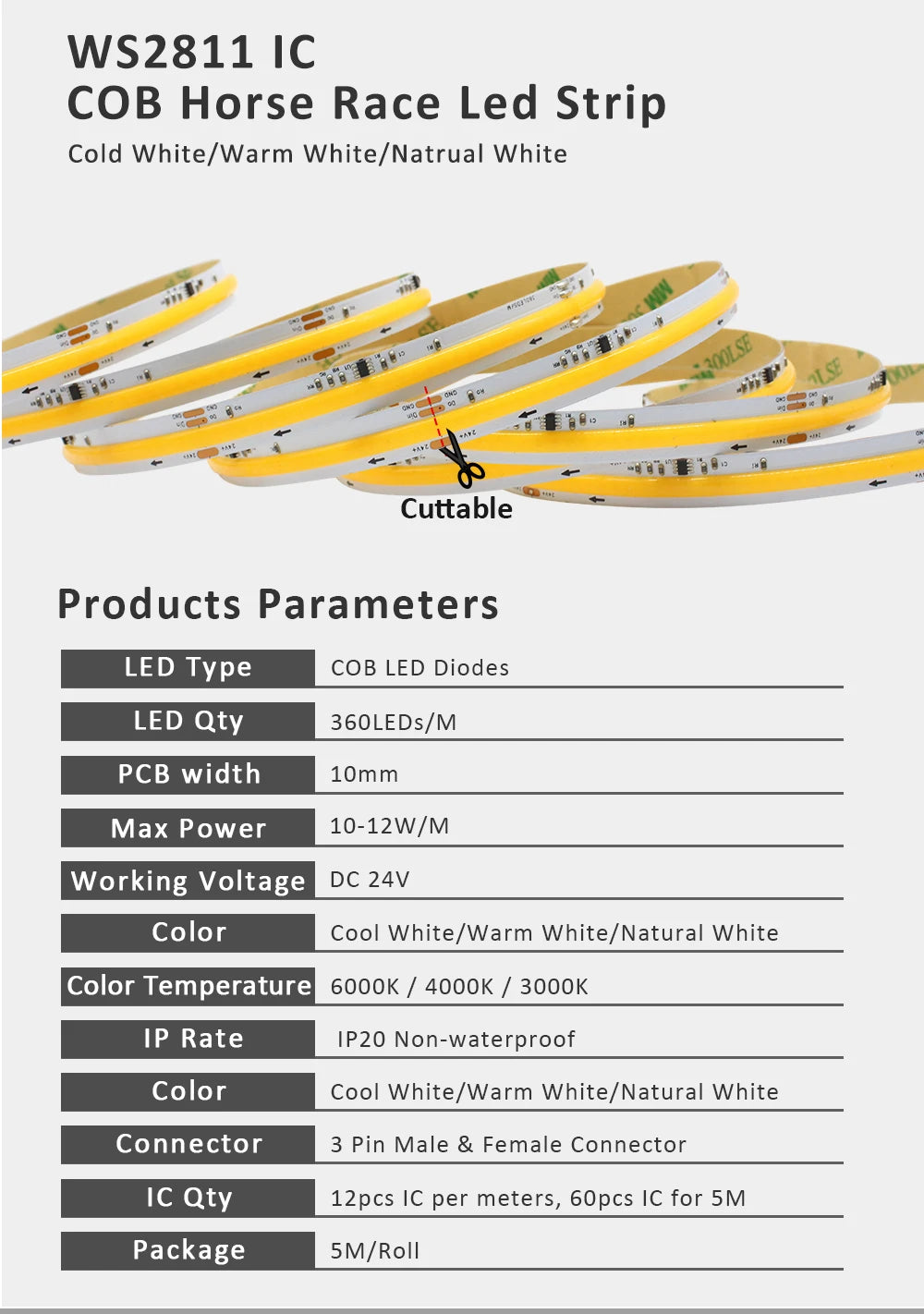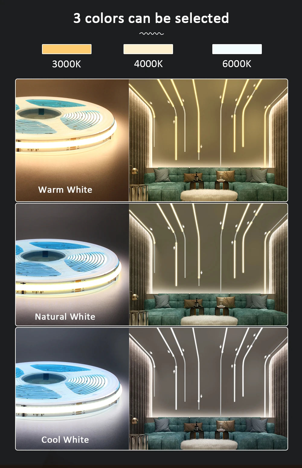 Color Temperature: Cool White 6000K / Warm White 3000K / Natural White 4000K