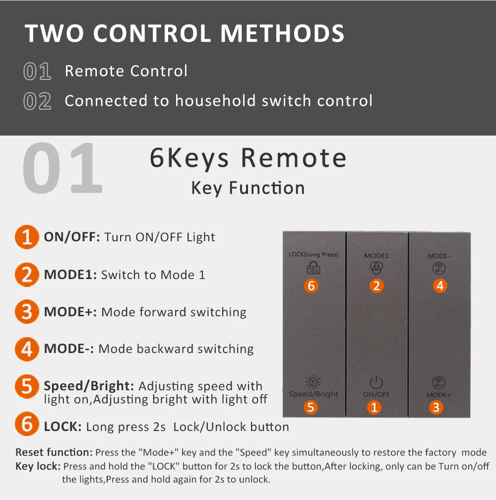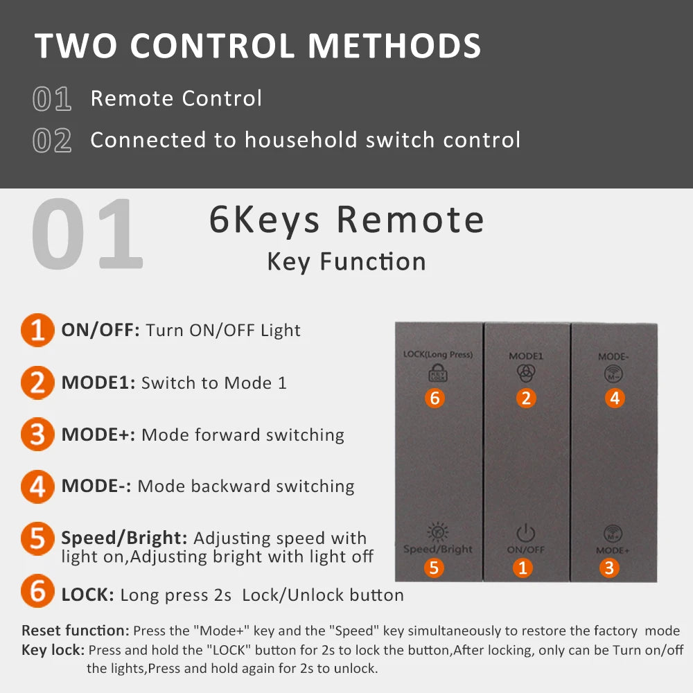 Panel Keys: 6pcs ( LOCK, MODE1,MODE+,MODE-,ON/OFF, Speed/Bright