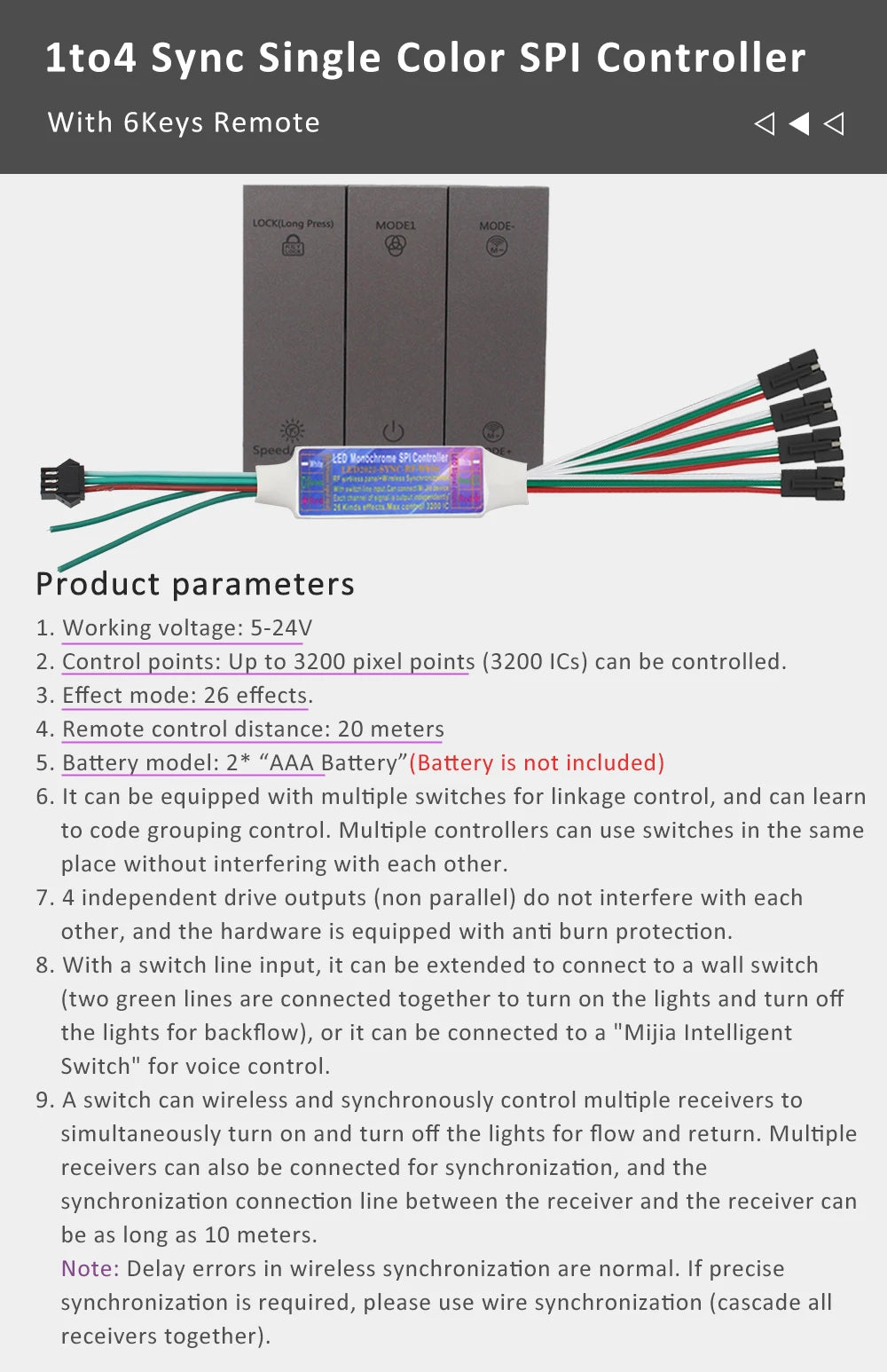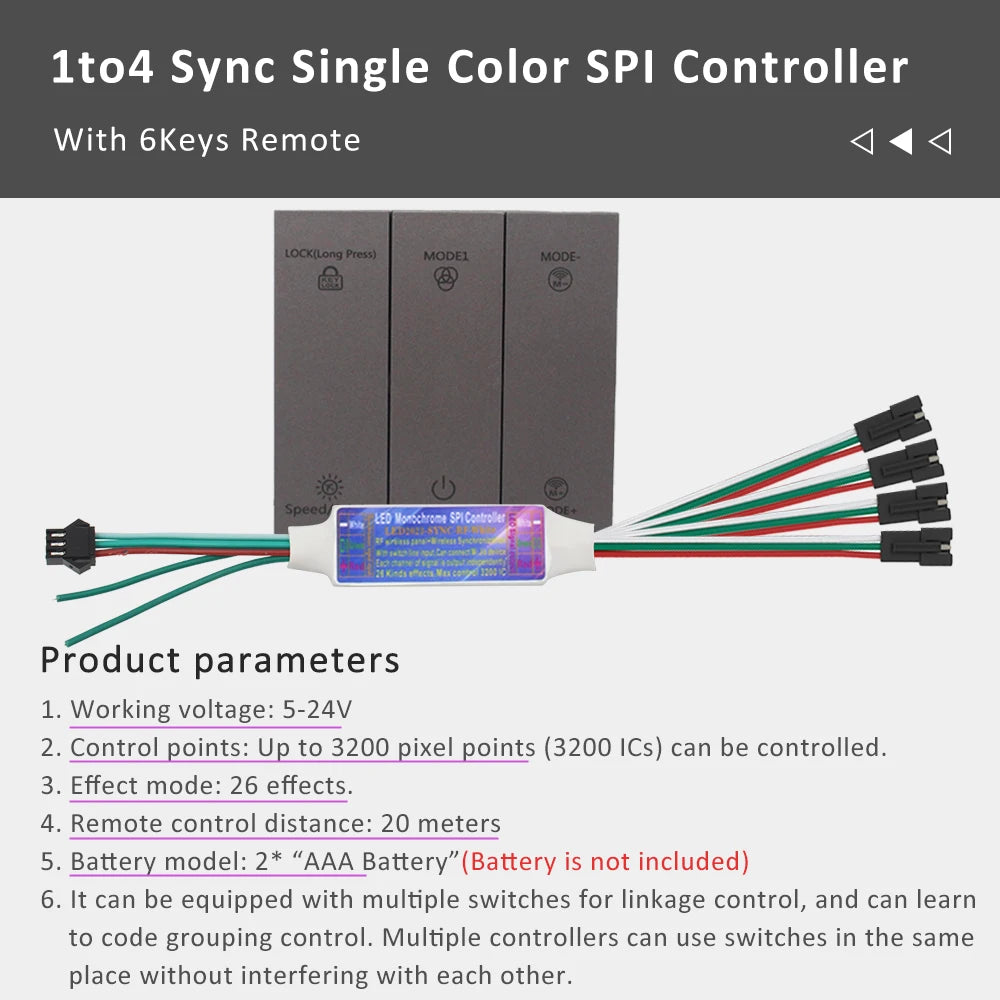 Wire Connection Sync Working:99.99% sync (Recommend),If you want 40M sync control, just buy 2pcs x 20M full set, two controller can be connect together to make it sync working by one 6Keys remote/Normal Switch.