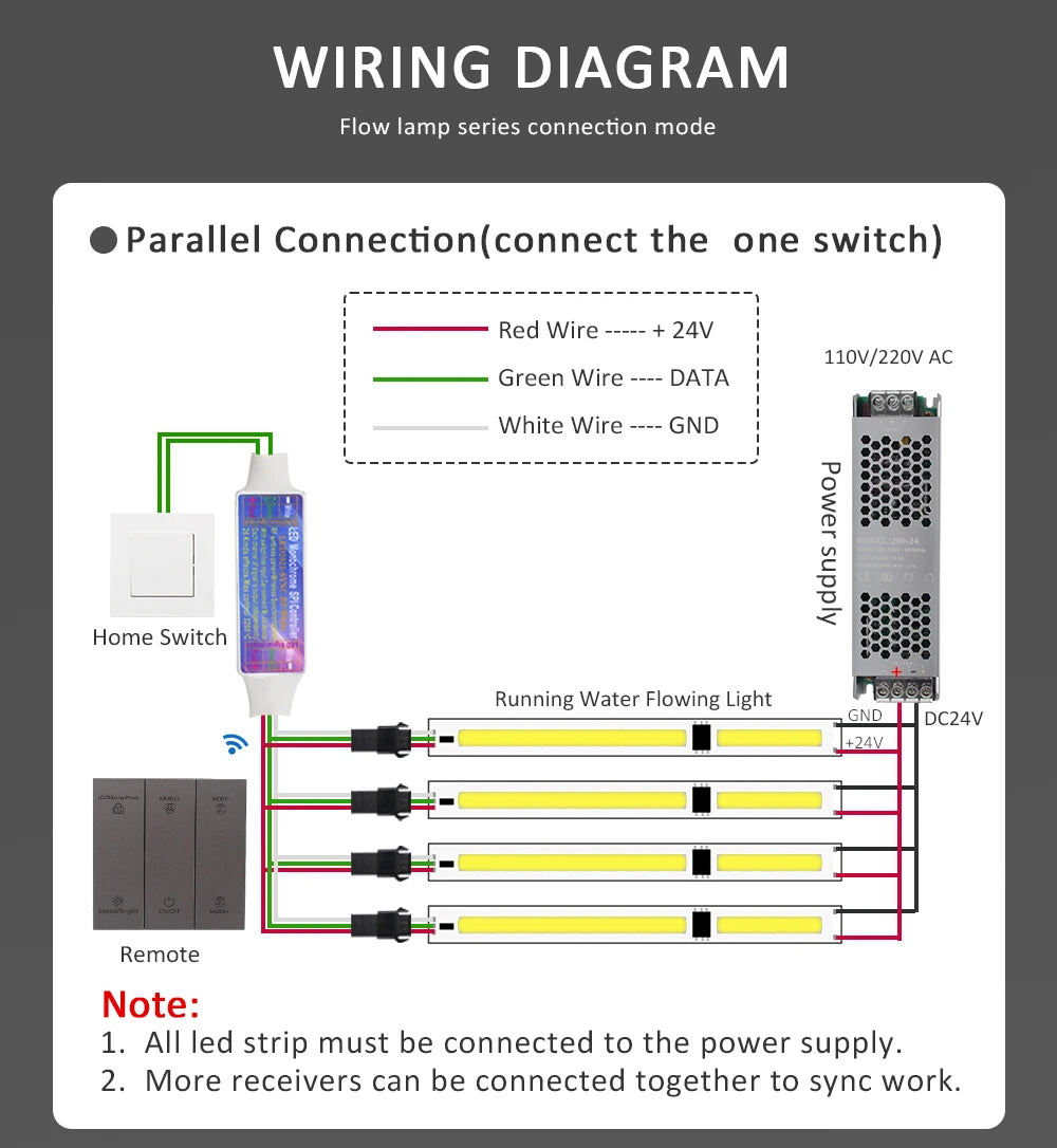 If you want to control longer horse race led strip for a project,just buy addtional 24V power supply from our store,there is a wiring diagram in the bottom of this page.