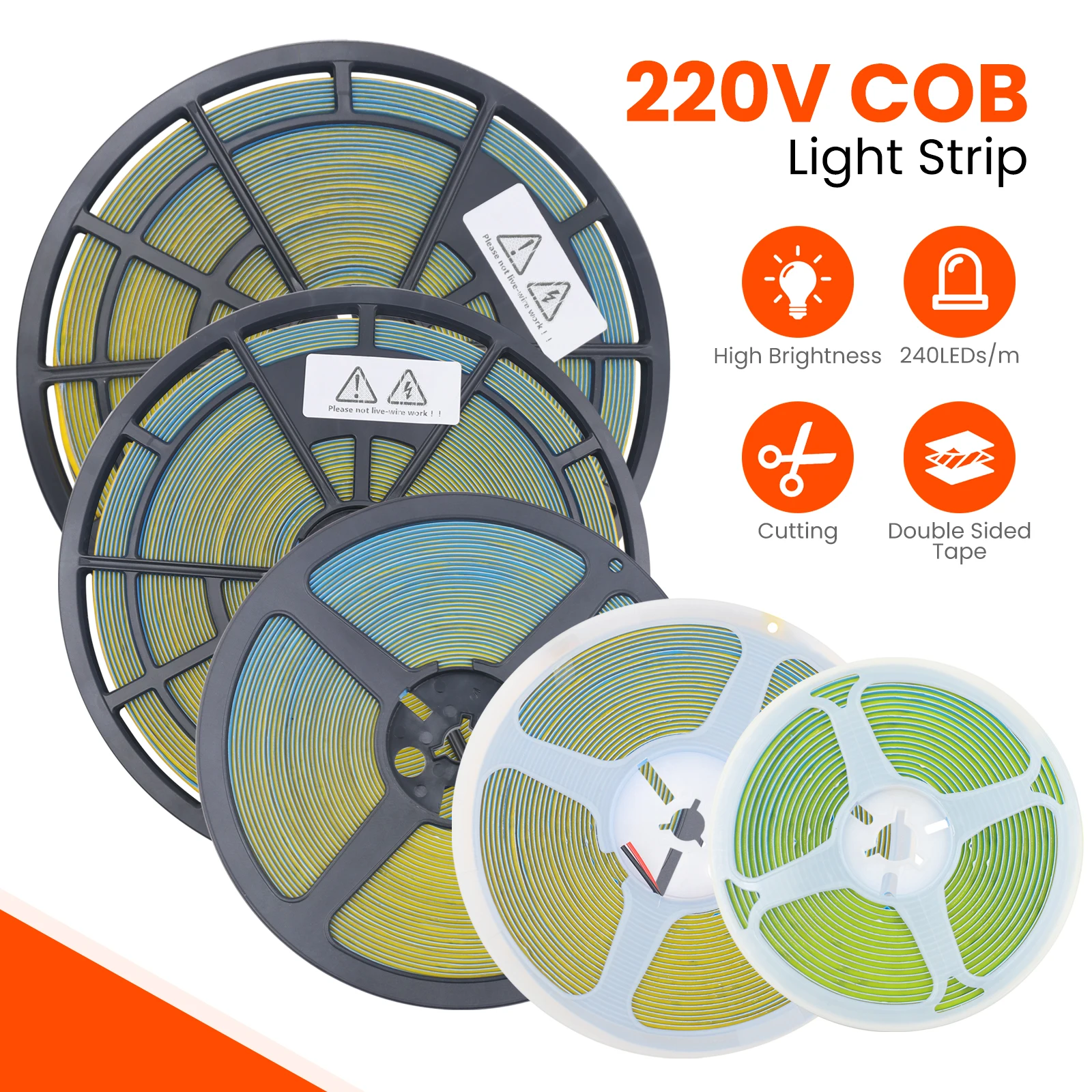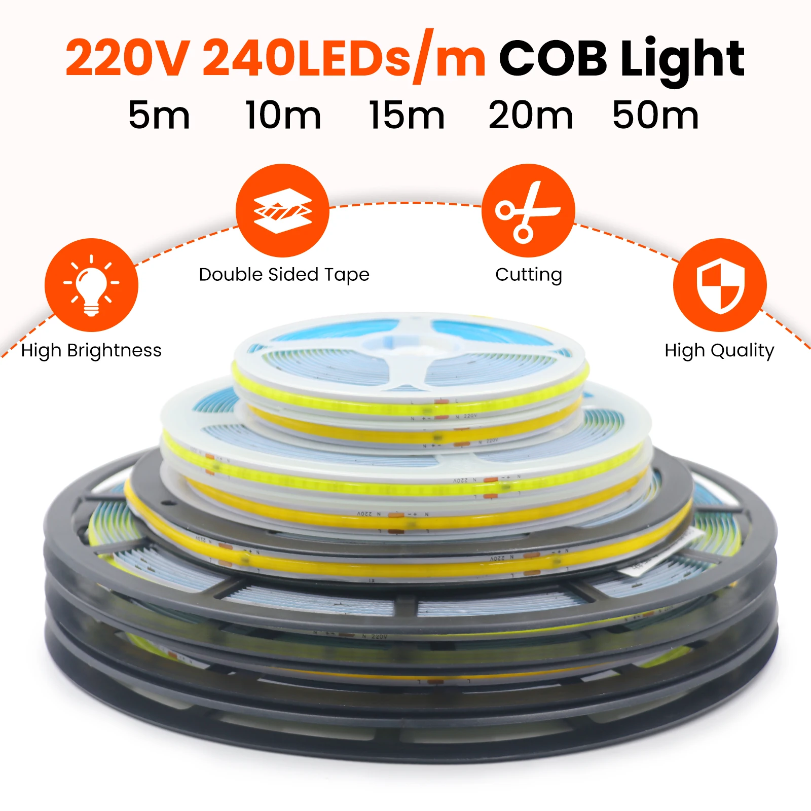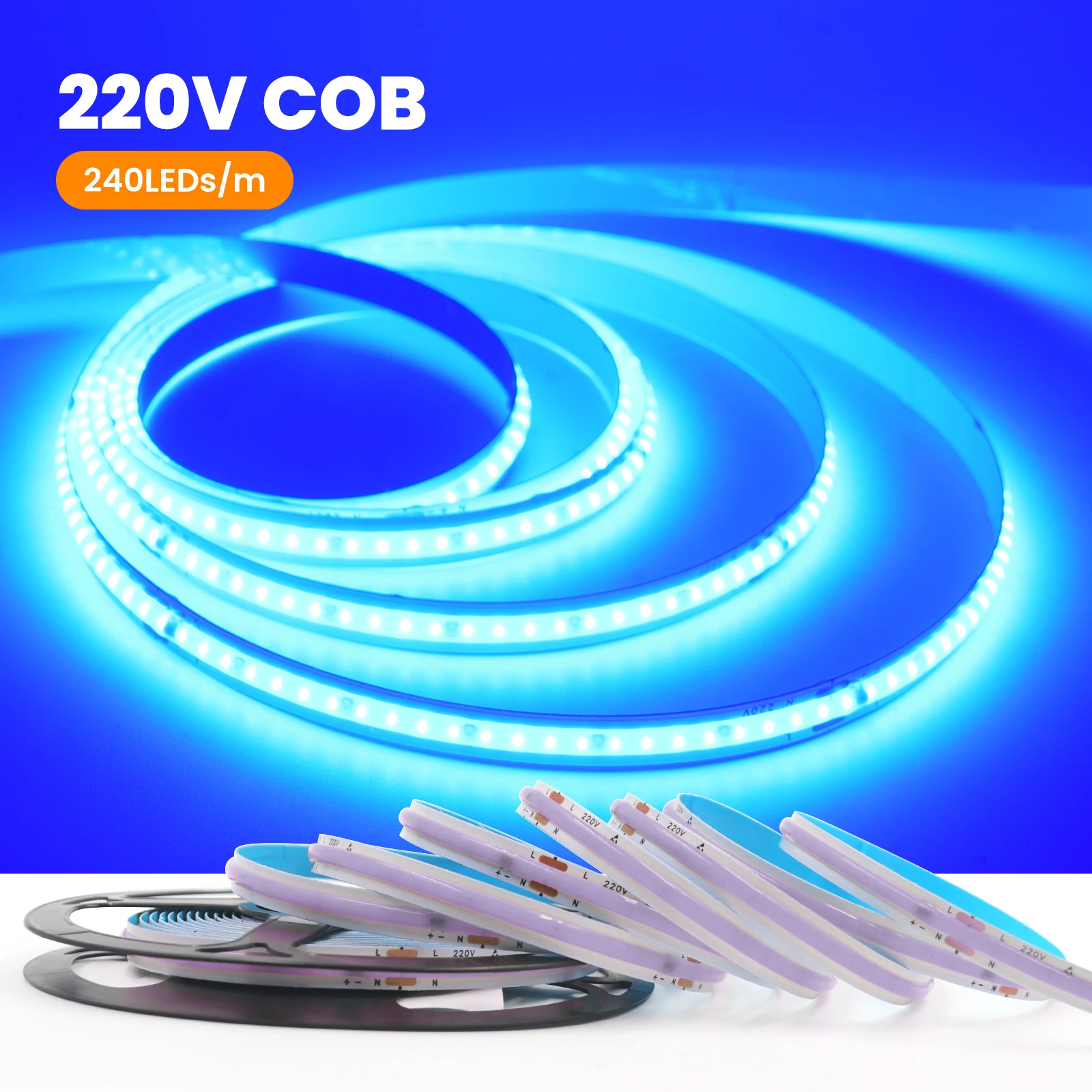AC 220V COB Strip 240Leds/M 5M 10M 20M 50M/Roll Red/Green/Ice Blue/Pink/White/Purple Flexible Ribbon LED Light For Home Decor
