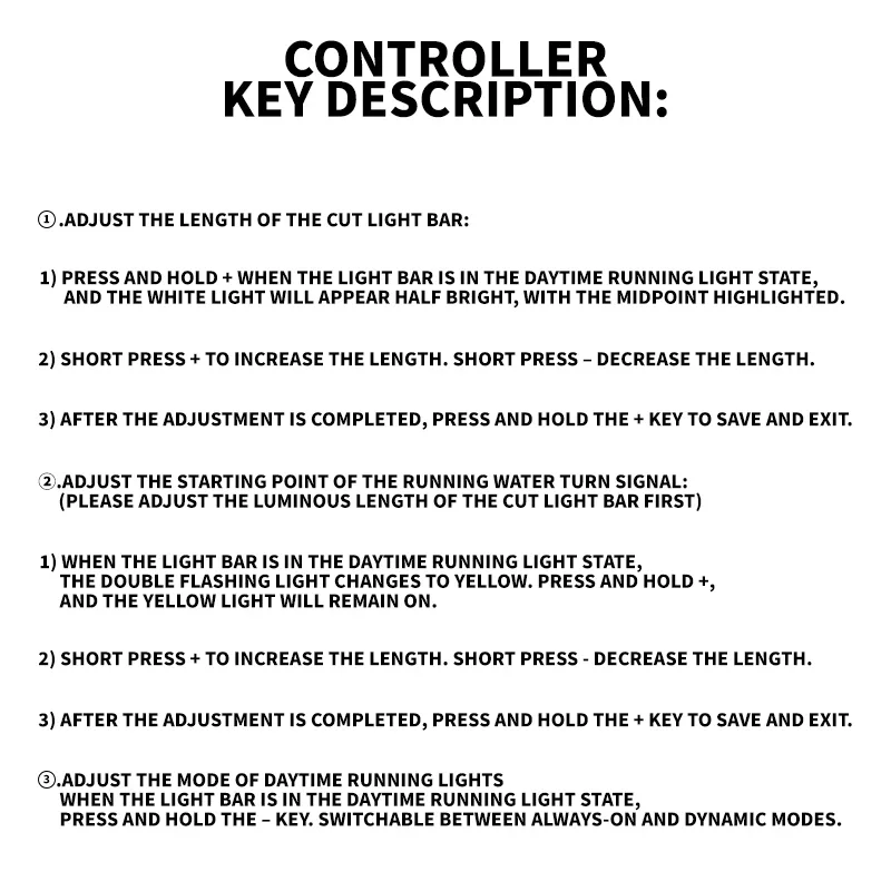 a. When the light bar is in the daytime running light state, the double flashing light changes to yellow. Press and hold +, and the yellow light will remain on.