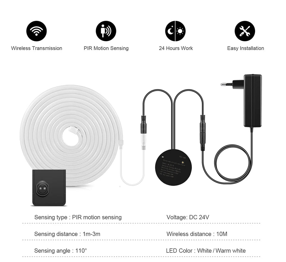 The Motion Sensor Neon LED Strip Lights feature a high-quality construction using real silicone material, ensuring durability and longevity. With an input voltage of DC24V and a warm white or white light color option, you can customize the lighting to suit your preferences. The Motion Sensor Switch, powered by a built-in 450mA battery, allows you to control the lights wirelessly from a distance of up to 10 meters, making it convenient to turn the lights on and off without any hassle.