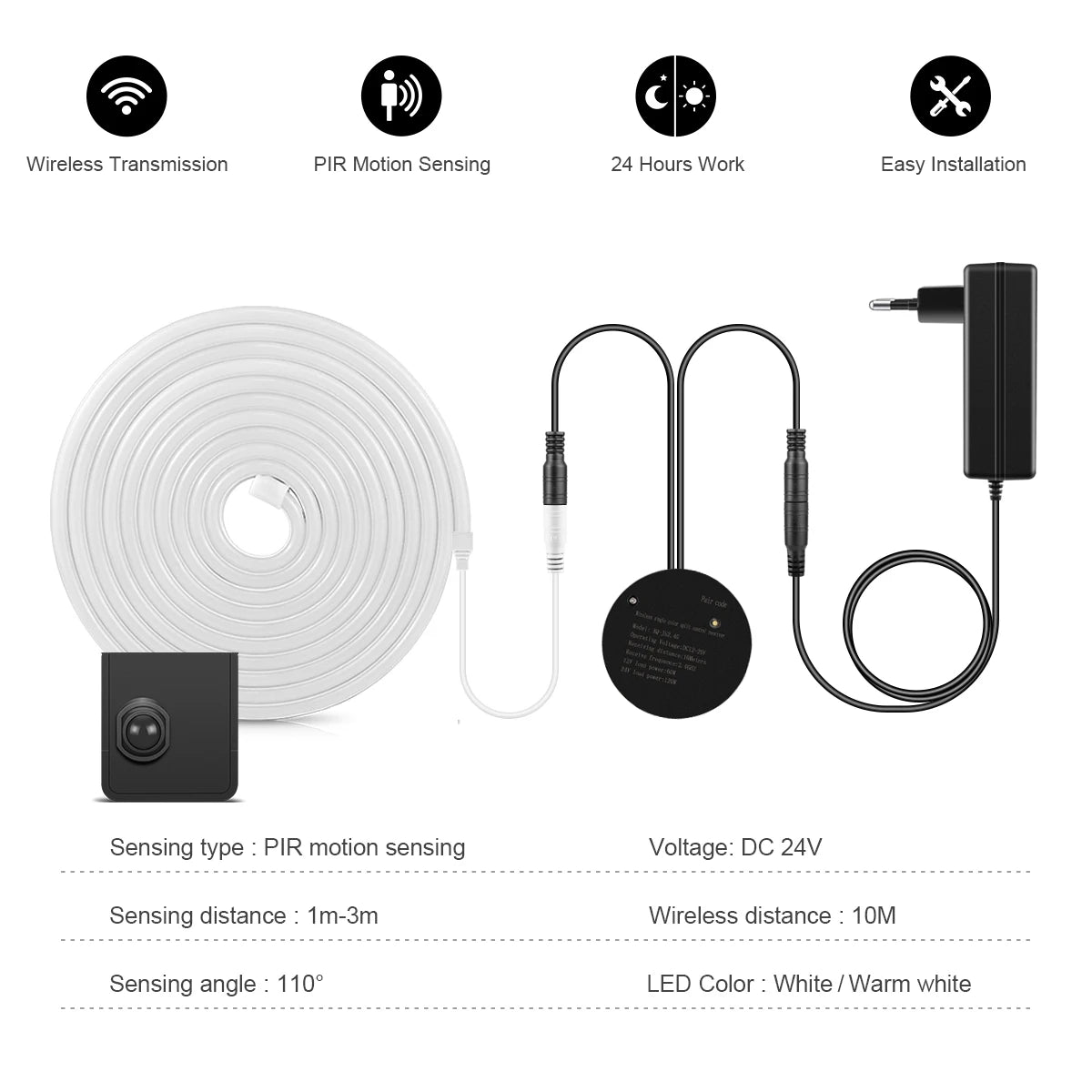 10M 5M 2M Two PIR Motion Sensor Switch 24V Neon LED Strip Light 120leds/m Night Lamp for Bathroom Bedroom Stair Cabinet Decor