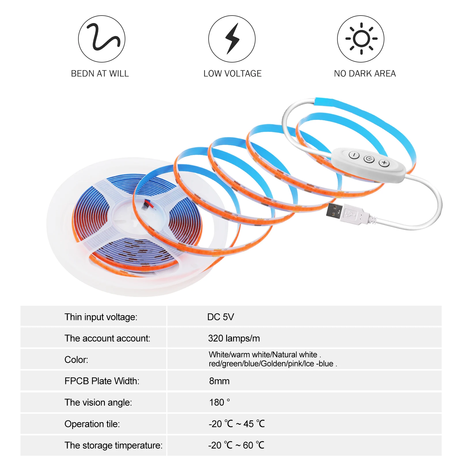 5V COB LED Light Strip With Touch Dimmer/ON OFF Switch/3Key Dimmer 320LEDs/M High Density LED Lamp Room Bar TV Backlight 9Colors