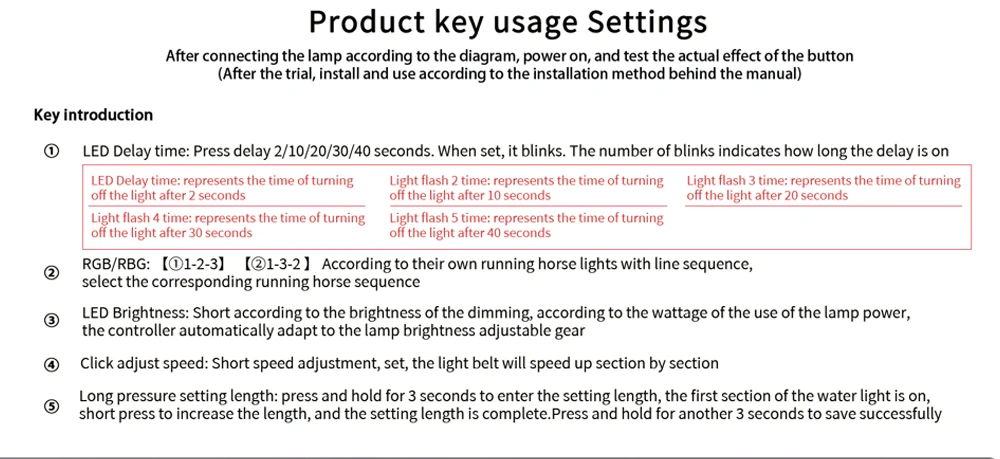 1.   Timer Delay OFF (2s,10s,20s,40s,60s,80s Auto-delay-off adjustable)