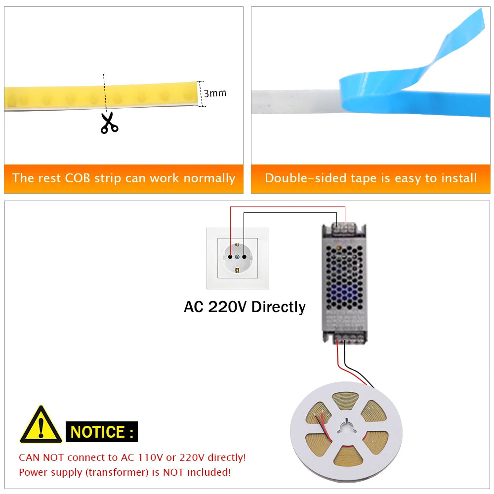 Please note that soldering may be present in electronic products, which is normal and does not indicate a quality issue. Additionally, the COB LED strip is designed to be connected to a DC 12V/24V transformer and cannot be directly connected to AC 110V/220V. The power supply transformer is not included in the package and must be purchased separately.