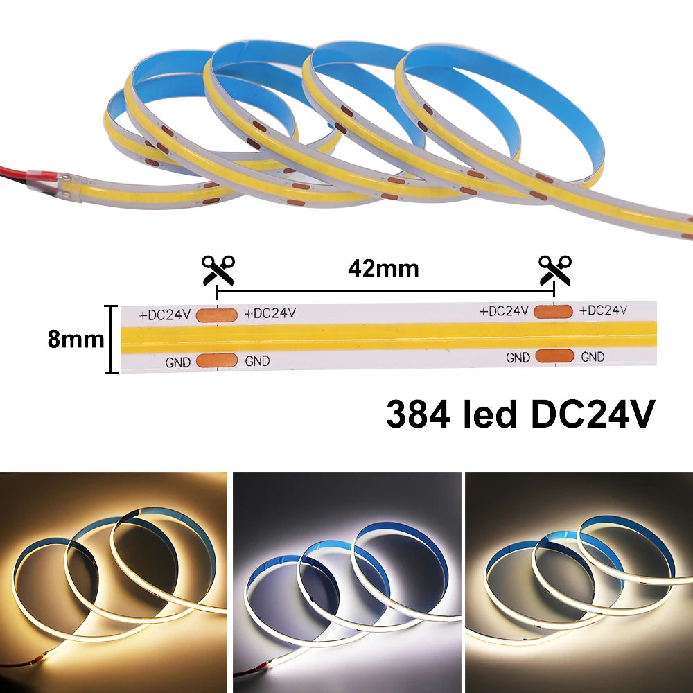 DC 5V 12V 24V COB LED Strip 320 384 480 528LEDs/m High Density
