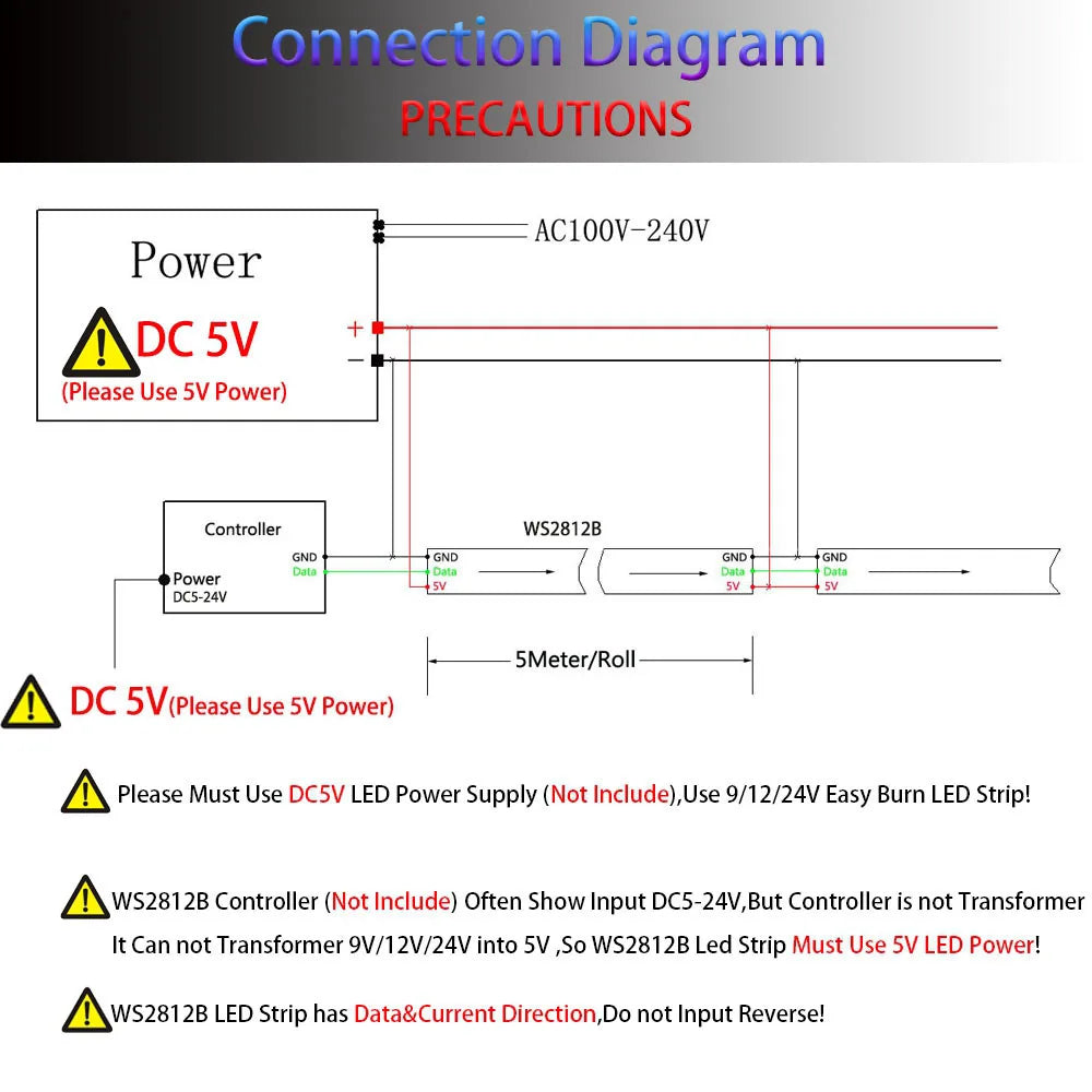 (Important: WS2812B Must Work With 5V LED Power Supply,Over DC5.5V Will Burn Led Strip)