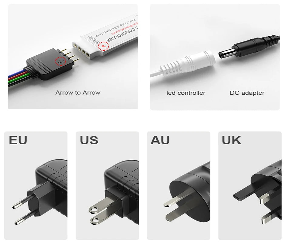 5M=1*5M/Roll RGB Strip+1*RGB Controller+1*Remote Controller+1*Power Adapter