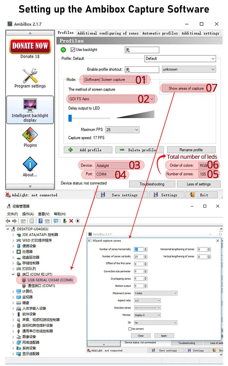 2.3. Select device and set this as "Adalight", under menu of "Intelligent backlight display", select the Port and the COM Port that your device has been detected. If select correctly, you can see Device Status: Connected, also down the bottom left it will say Adalight: connected. If cannot find USB driver/COM port, please download USB CH340: https://drive.google.com/file/d/1GS5FrjN5620I_RKJMOe5IAGNSqlke9jC/view?usp=sharing