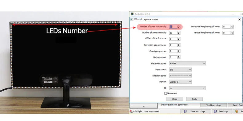 Connect everything well and set up capture area in Ambibox first. If everything is ok after testing, then you can stick the strip on the monitor and cut LED strip by demand.