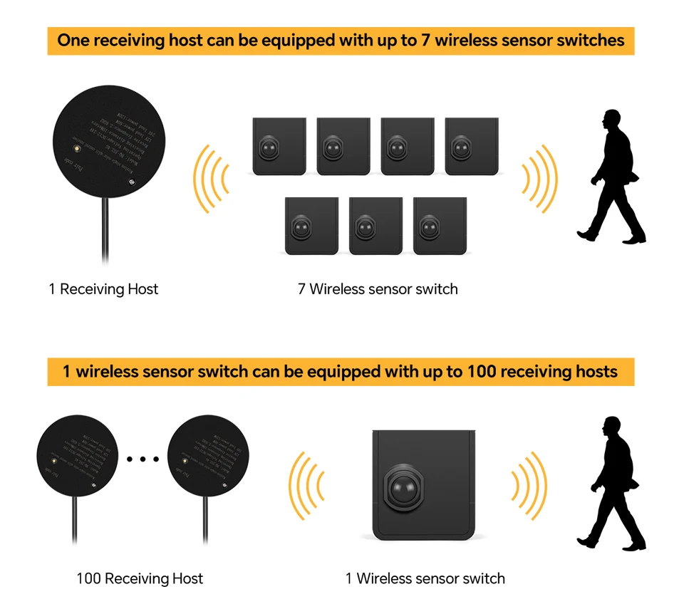 3. One receiving host can be equipped with up to 7 wireless sensor switches at most.