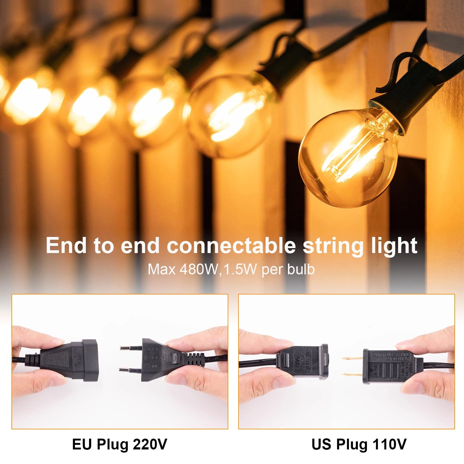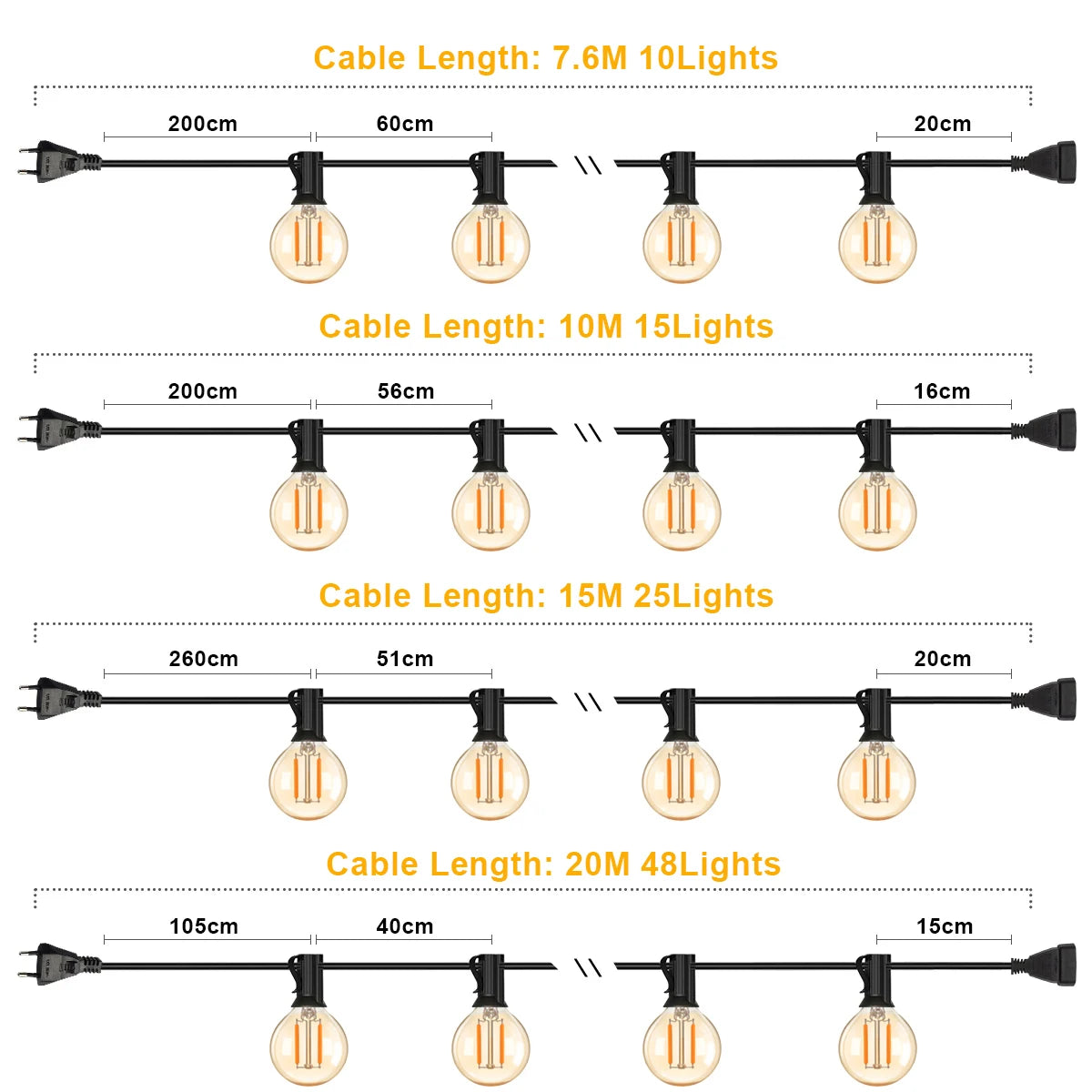 • 【Feature】There are 4 lengths of G40 outdoor light string: 7.6M(25ft) with 10sockets,10M(33ft) with 15sockets,15M(50ft)with 25sockets,20M(65ft) with 48 socekts.The string light provided EU plug 220V and US Plug 110V.Please check every details before you order the item.